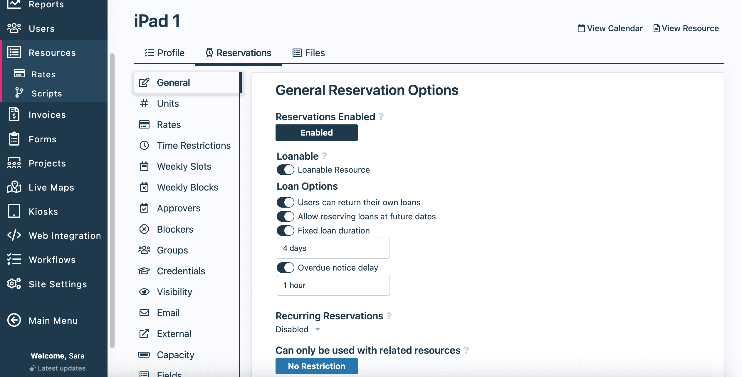 Your resource must be set to Loanable. To do this, visit Reservations > General and set the resource to be Loanable. You can also choose Loan Options from here.