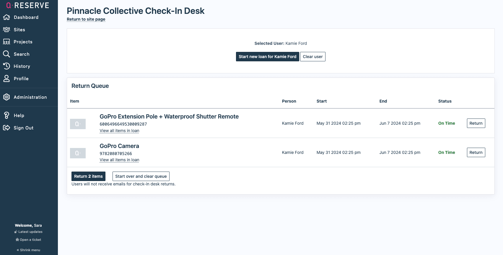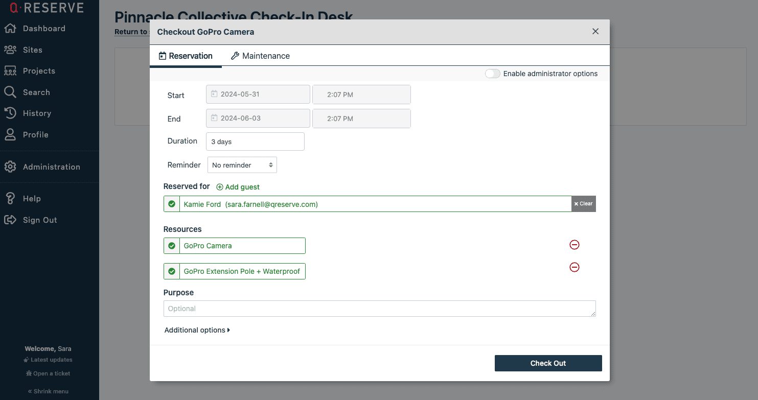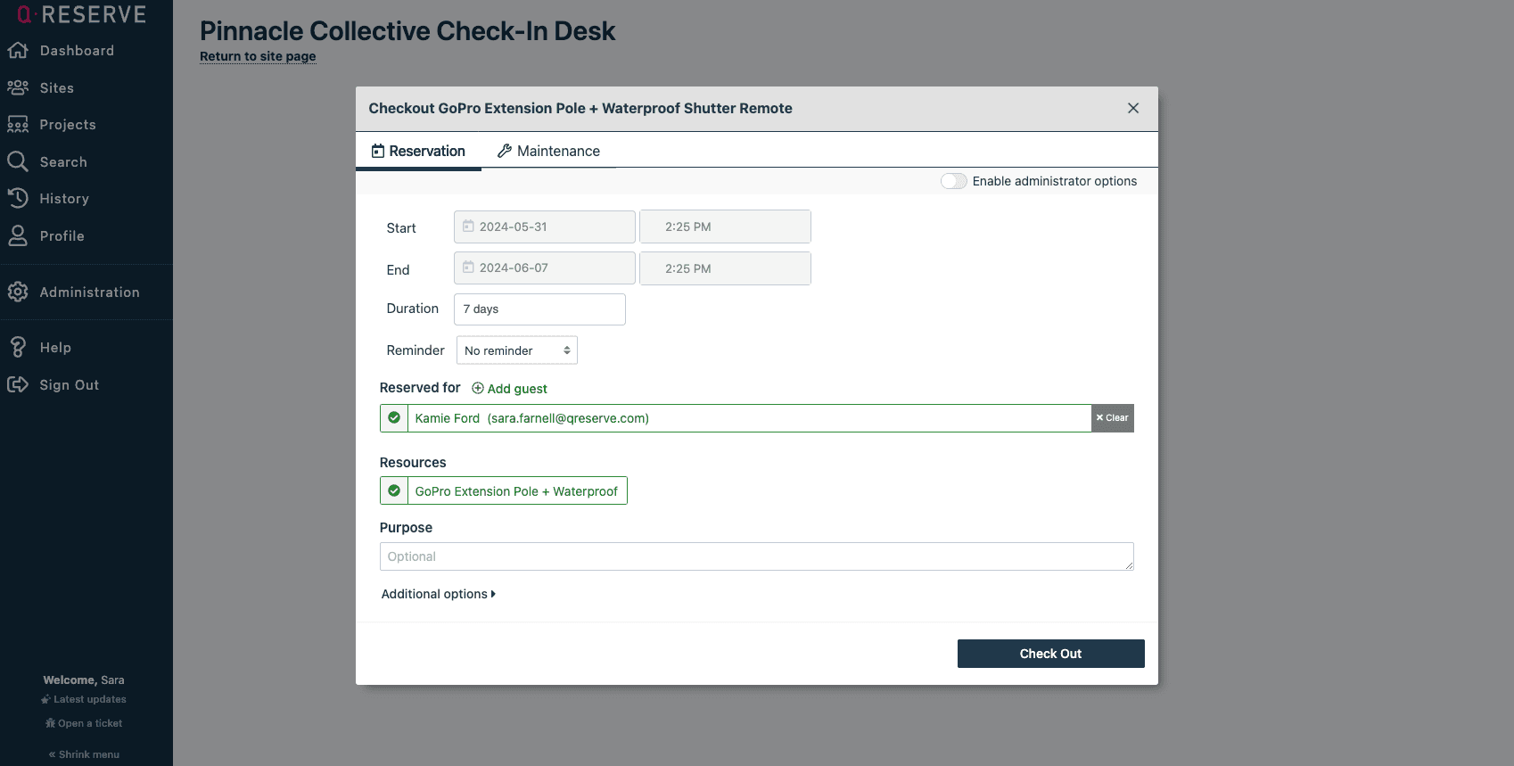 You can also begin the check-out process by scanning the item that is being borrowed (or manually search the item's name) and choose who is borrowing the item. Once the checkout process has begun you can scan more items to add to the reservation.
