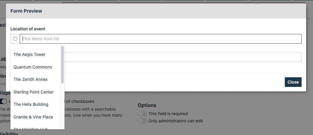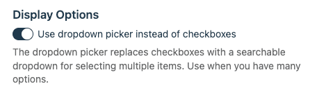 - Checkbox List: A list of simple on or off checkboxes with labels. A Checkbox List can be changed into a Dropdown Picker. This replaces checkboxes with a searchable dropdown for selecting multiple items and is best to use when you have many options.