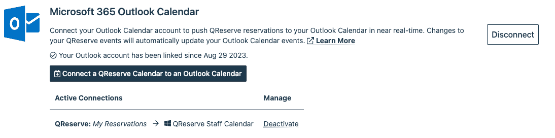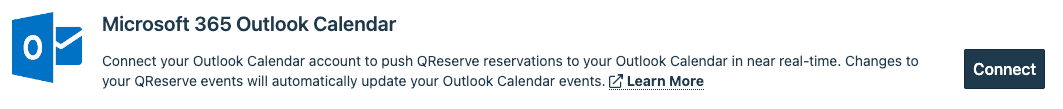 Click the Connect button in the Microsoft 365 row to authorize QReserve to view and update your Outlook Calendar data. QReserve will only push, modify, or remove reservations in your Outlook Calendar that were created in QReserve.