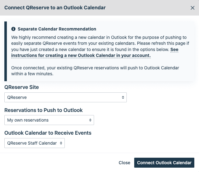 Once you have established a connection between a QReserve site and an Outlook Calendar, existing reservations (going back 30 days and 1 year in the future) will automatically be pushed during an initial synchronization that can take up to a few minutes to complete.