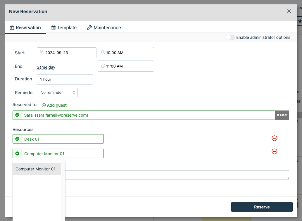 Now when booking Desk 01, the only resource that can be booked alongside Desk 01 is the related resource Computer Monitor 01.